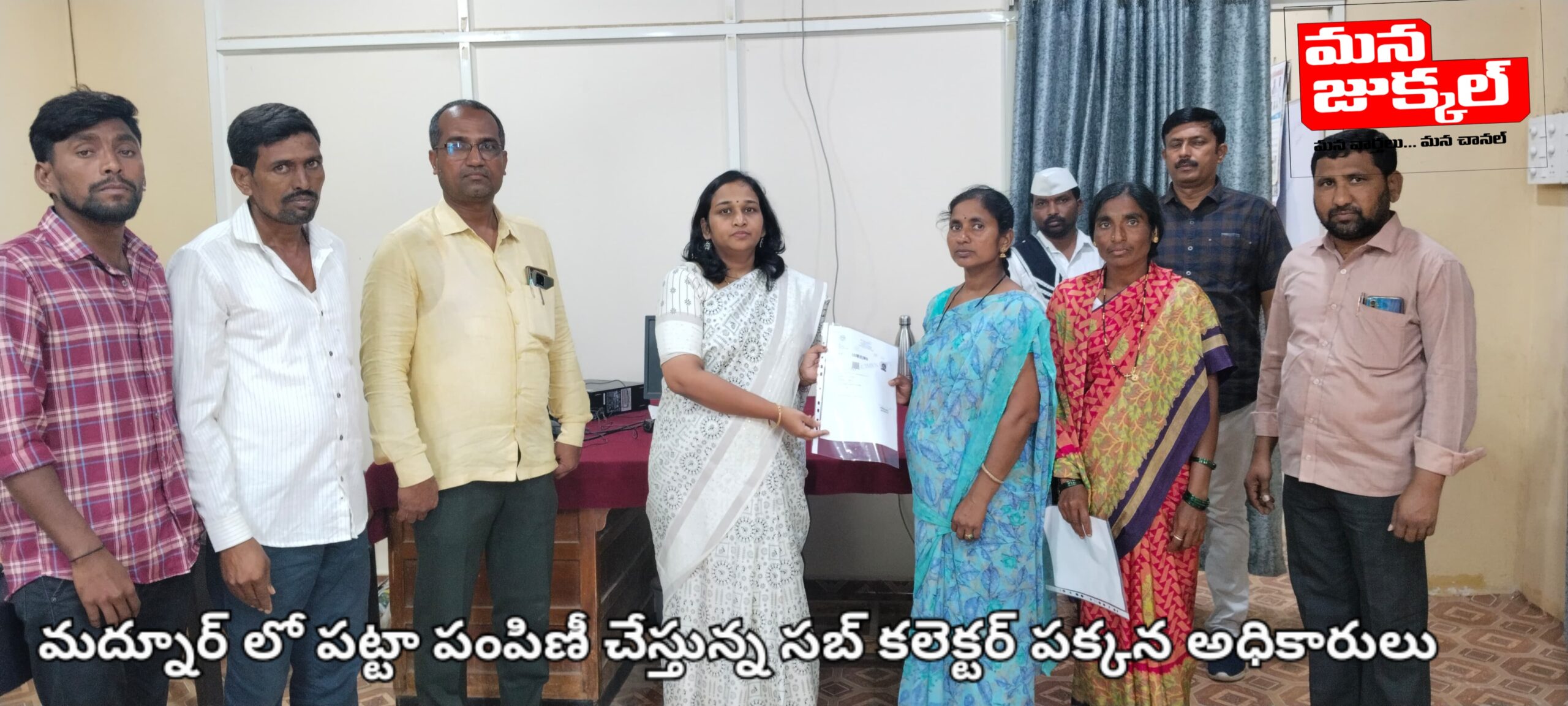 రాష్ట్ర ప్రభుత్వం ప్రతిష్ఠాత్మకంగా తీసుకువచ్చిన భూ భారతి చట్టం రెవెన్యూ సదస్సులో వచ్చిన దరఖాస్తుదారులకు పట్టాల పంపిణీ కార్యక్రమాన్ని బాన్సువాడ సబ్ కలెక్టర్ కిరణ్మయి ప్రారంభించారు. మండలంలోని సోమూర్ గ్రామానికి చెందిన హనుమంత్ వార్ శివ నంద, ఎబిత్వర్ పూల లబ్ధిదారులకు సబ్ కలెక్టర్ చేతుల మీదుగా తహసీల్ కార్యాలయంలో భూ భారతి రెవెన్యూ పట్టా హక్కు పత్రాలను అందజేశారు. పట్టా హక్కులు పొందిన వారికి శుభాకాంక్షలు అధికారులు తెలిపారు. లబ్ధిదారులు సంతోషం వ్యక్తం చేశారు. ఈ కార్యక్రమంలో తహసీల్దార్ ఎం.డి ముజీబ్, ఆర్.ఐ శంకర్, కార్యాలయ సిబ్బంది తదితరులు పాల్గొన్నారు.